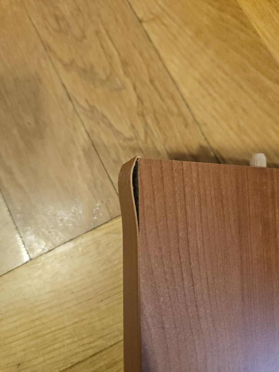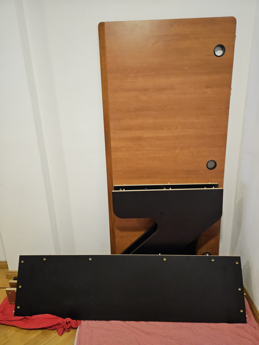 La mesa ya está desmontada. Incluyo una foto del único desperfecto que he encontrado: un tapacantos ligeramente despegado en una parte no visible de la mesa.