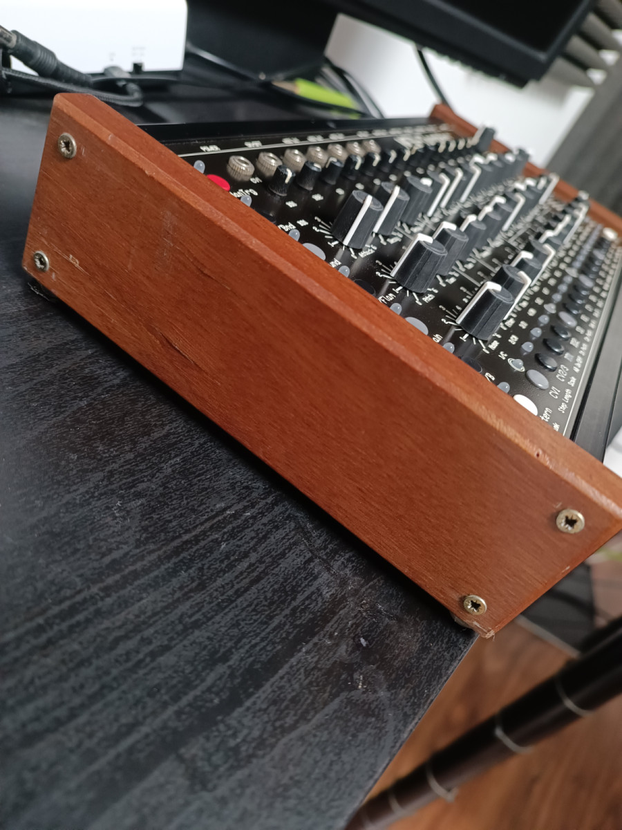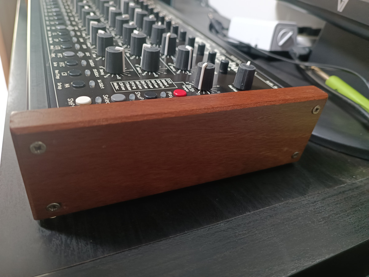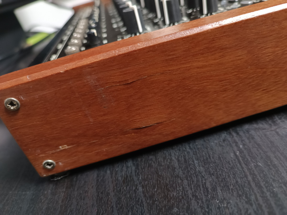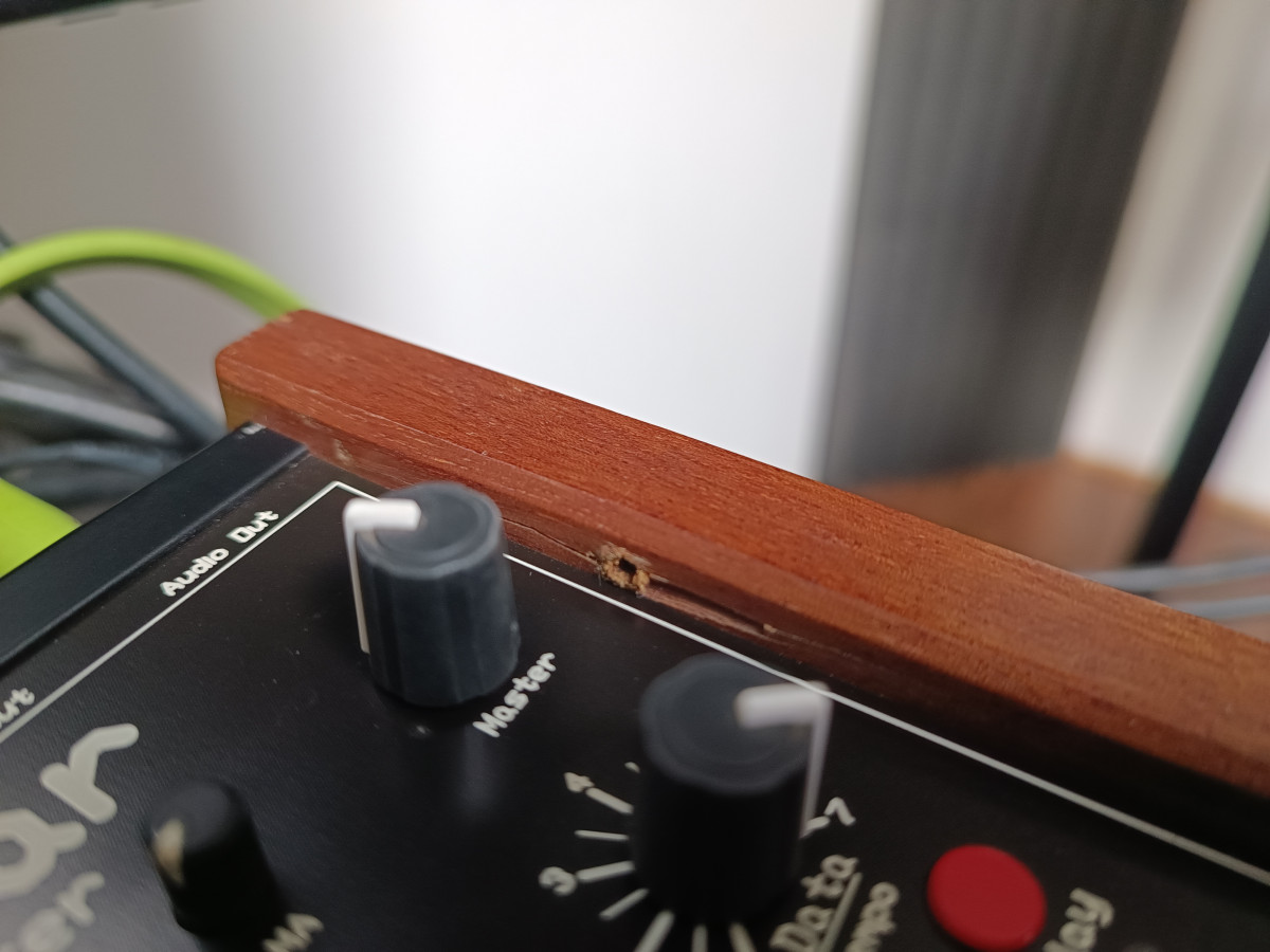 Caja de ritmos analogica en perfecto estado de funcionamiento, como marcas esteticas tiene un agujero pequeño en un lateral de madera y el otro lateral esta ligeramente rajado, se puede ver en las fotos, pero es muy poco visible a primera vista, a pesar de estas marcas esteticas como he dicho anteriormente la maquina funciona a la perfección y suena de lujo.