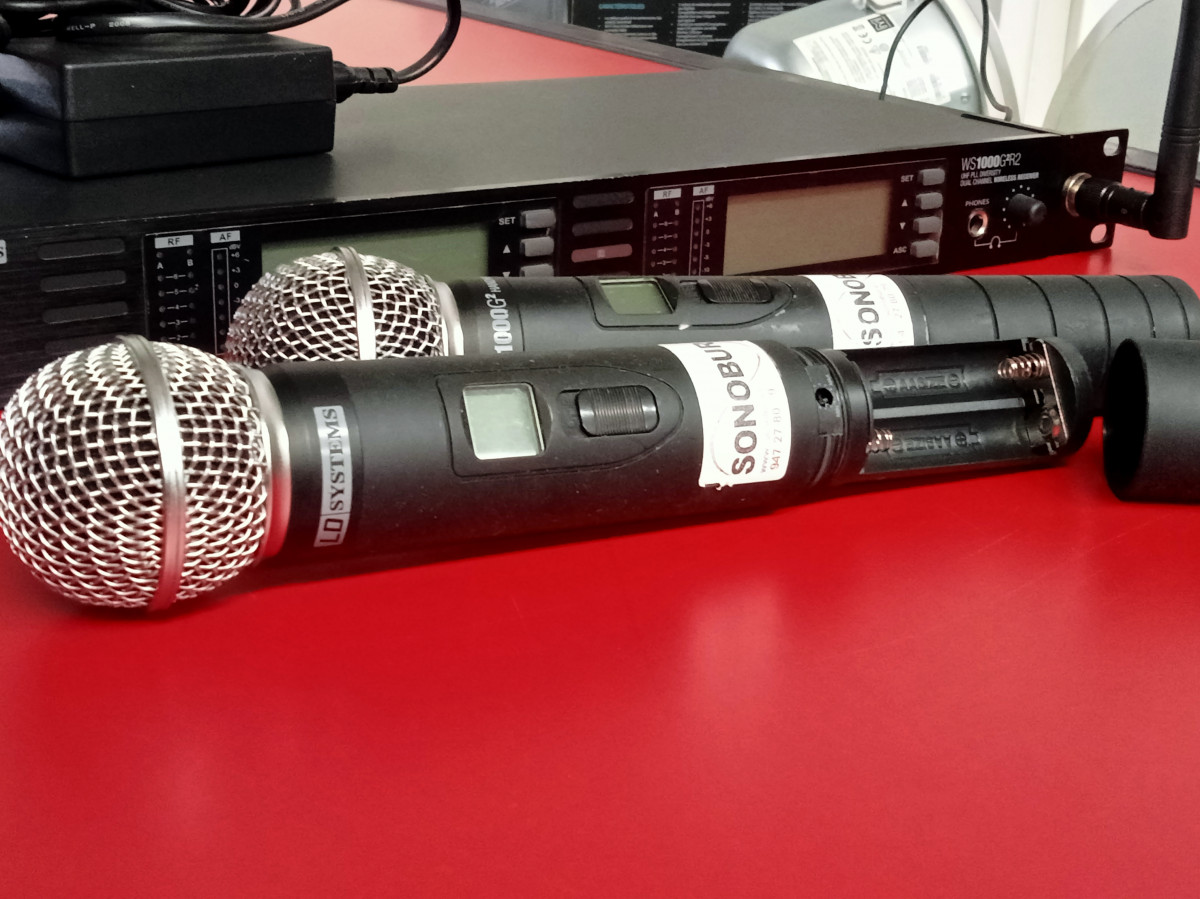Vendo receptor doble de microfonía inalámbrica LD WS1000G2R2 con dos micrófonos de mano inalámbricos y petaca LDWS1000G2BP con diadema color carne LDWS100MH1.