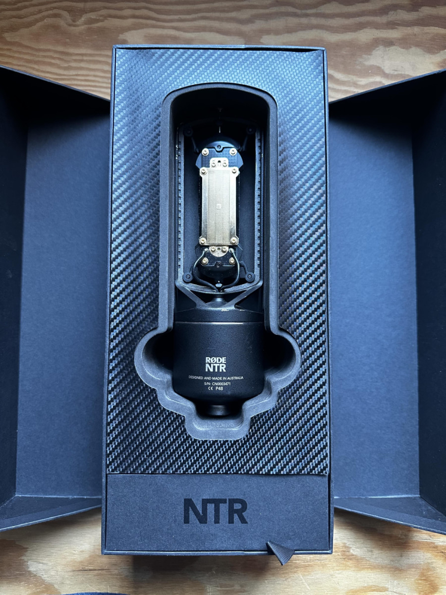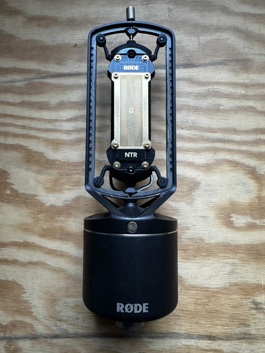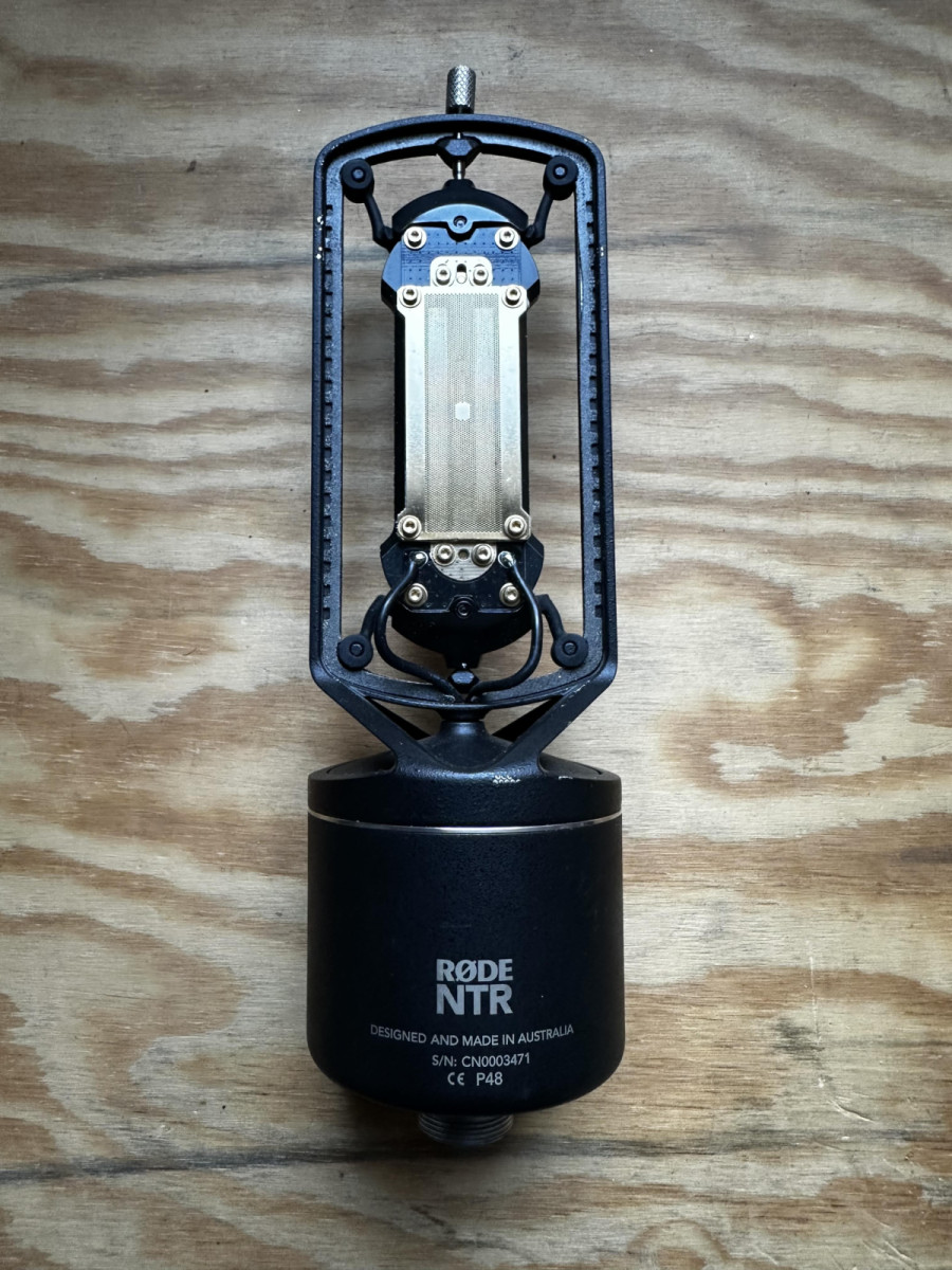 Micrófono de cinta Rode NTR. Estaba instalado fijo en el estudio y le quité las mallas metálicas delantera y trasera, las cuales no localizo. Quitando eso el micrófono funciona perfectamente y si se va a tener instalado fijo no es un problema.