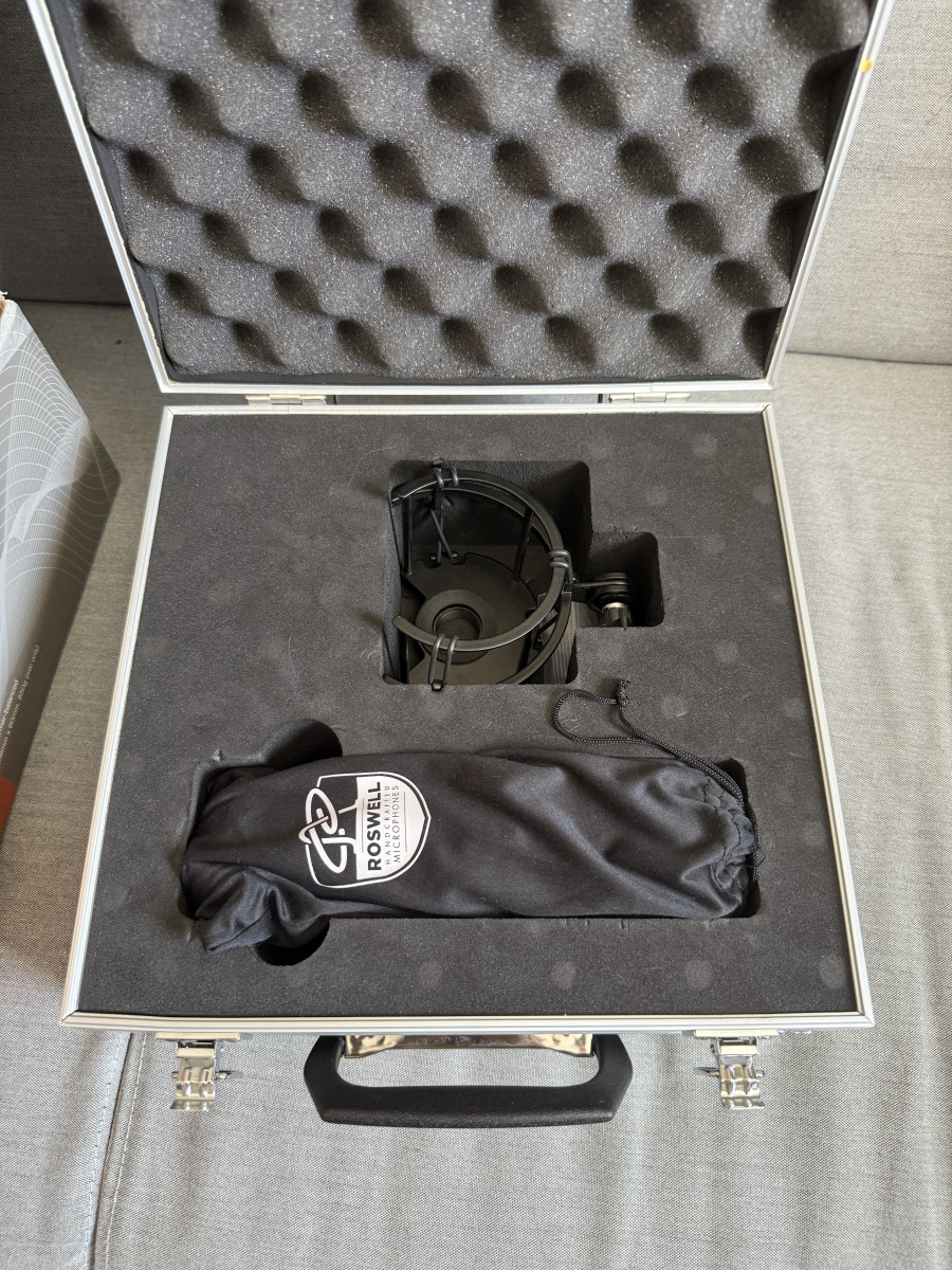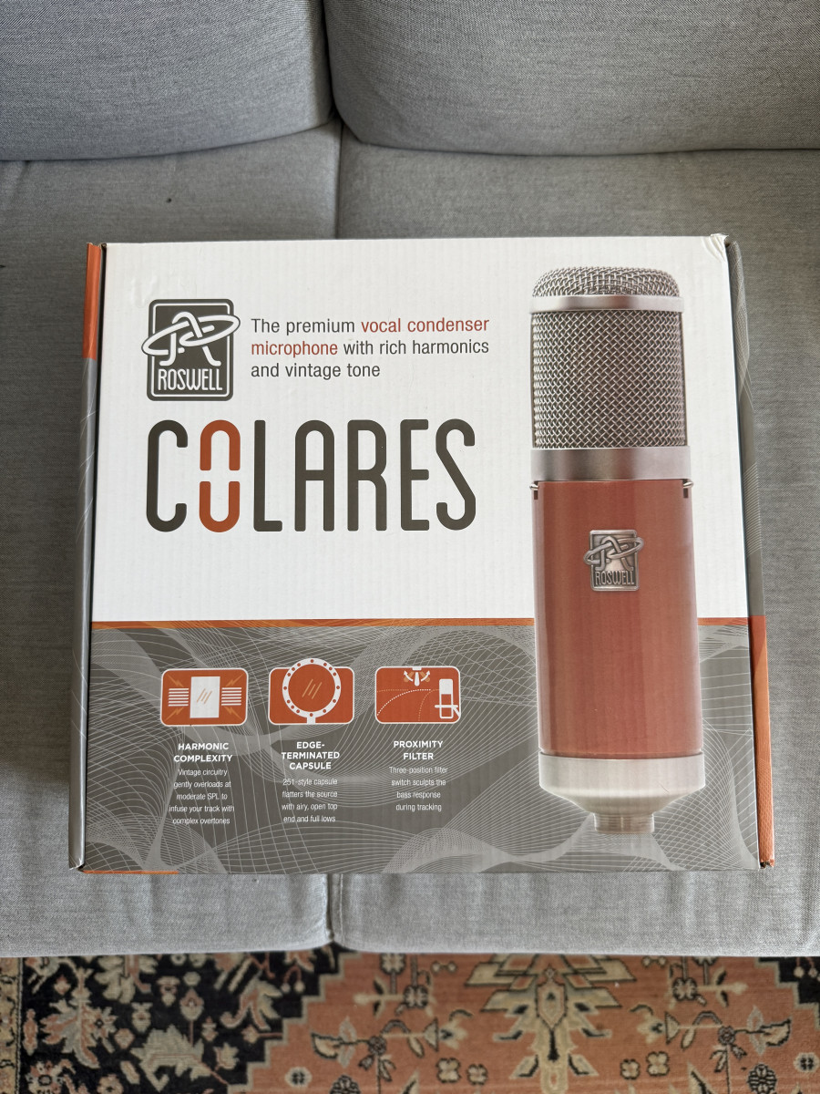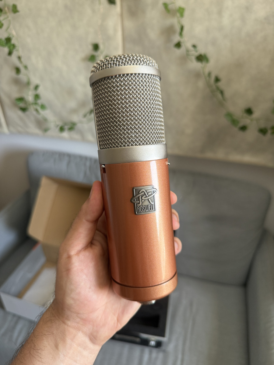 Microfono Roswell Colares en color cobre. Micro boutique, fabricado a mano en USA y con una calidad increible en las grabaciones. Está en perfecto estado, super cuidado y nunca ha salido del estudio. Incluye el micrófono, la araña, la caja, los papeles y el maletin.