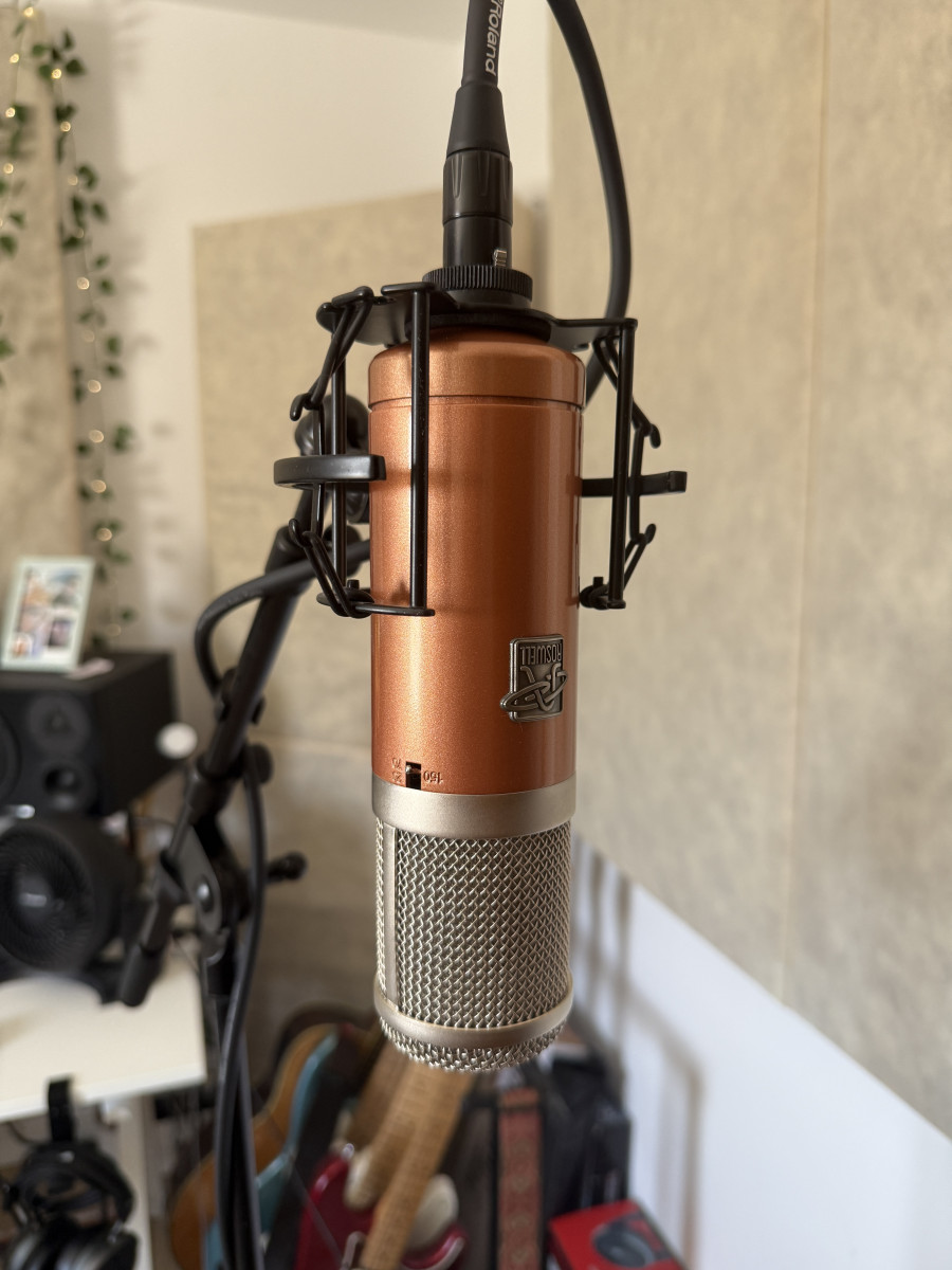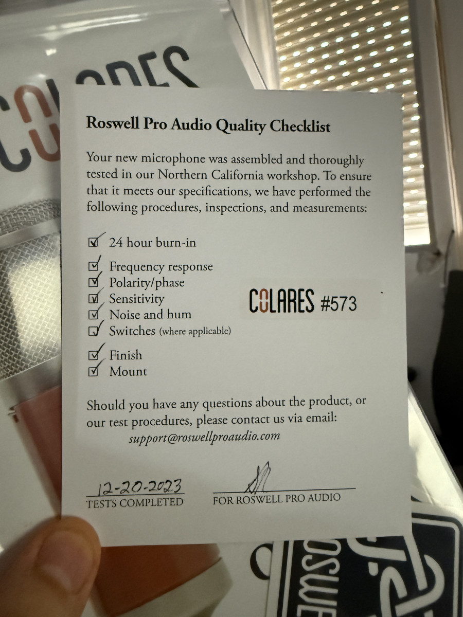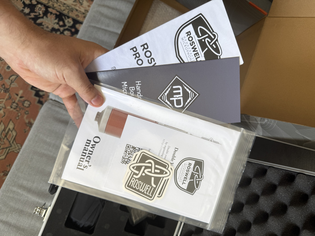 Microfono Roswell Colares en color cobre. Micro boutique, fabricado a mano en USA y con una calidad increible en las grabaciones. Está en perfecto estado, super cuidado y nunca ha salido del estudio. Incluye el micrófono, la araña, la caja, los papeles y el maletin.