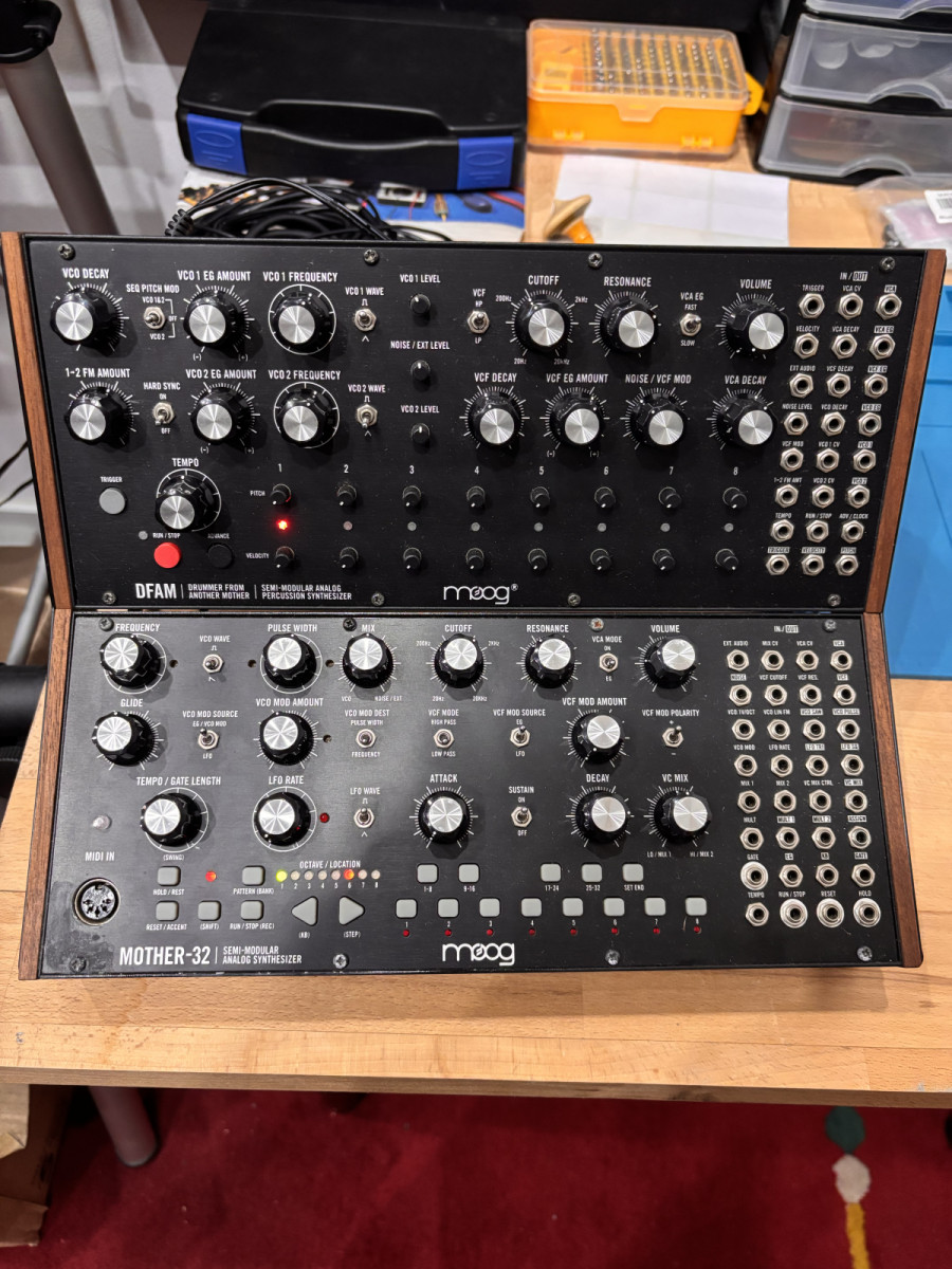”¡Lleva tu música al siguiente nivel con este dúo de sintetizadores analógicos de Moog! El DFAM y el Mother-32 son la combinación perfecta para crear texturas únicas, secuencias envolventes y un sonido analógico auténtico. En excelente estado, listos para inspirarte en tus producciones. ¡No dejes pasar esta oportunidad!” Con rack incluído, libros, transformadores y plantillas.