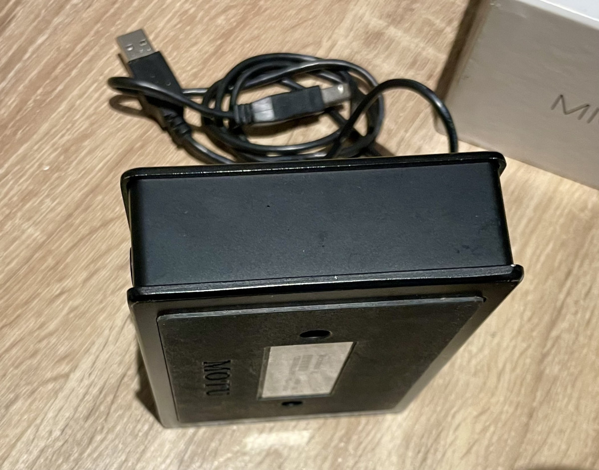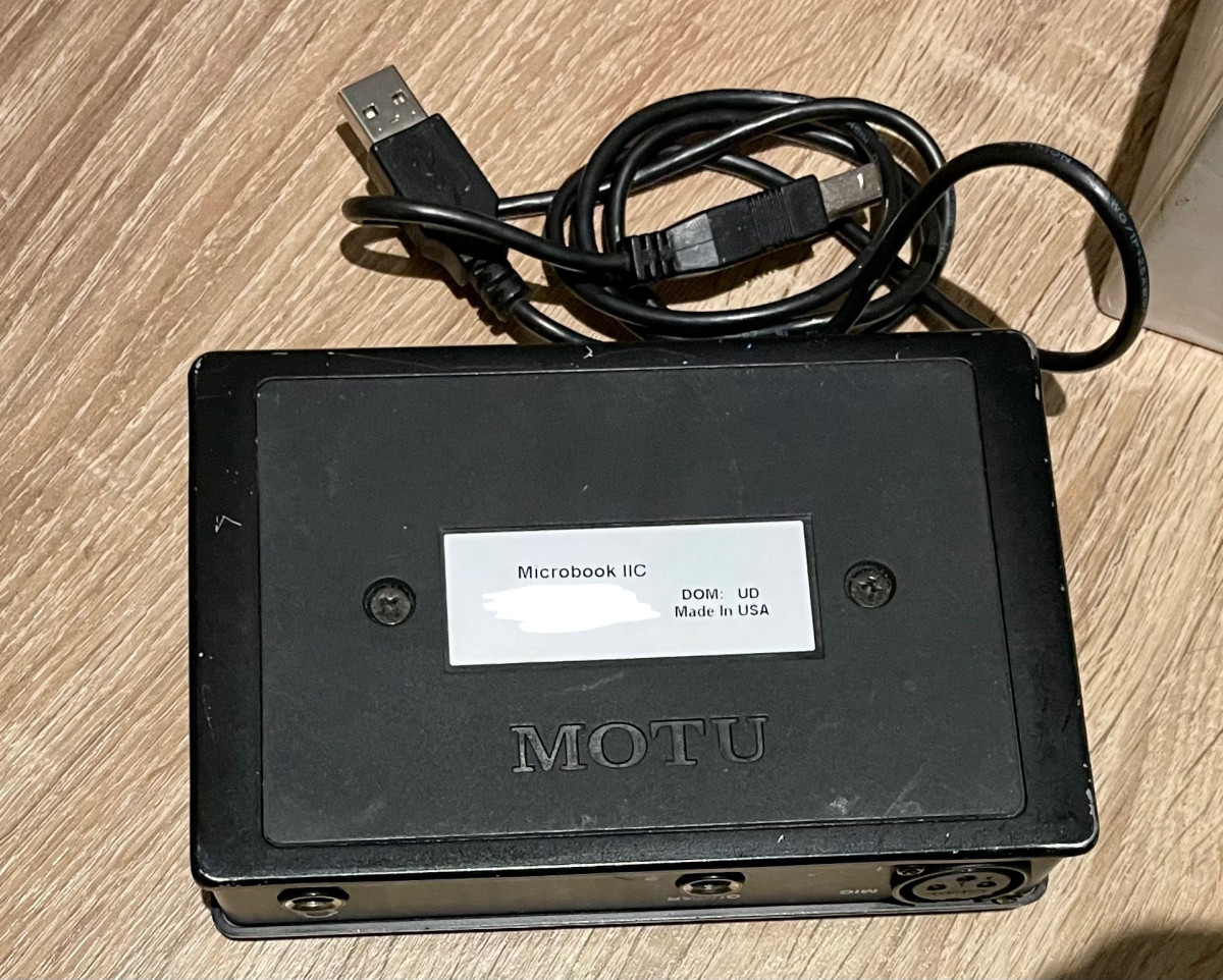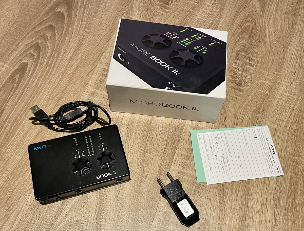 Interfaz de audio MOTU Microbook IIc en color negro. Incluye su caja original, cable USB y adaptador de corriente.