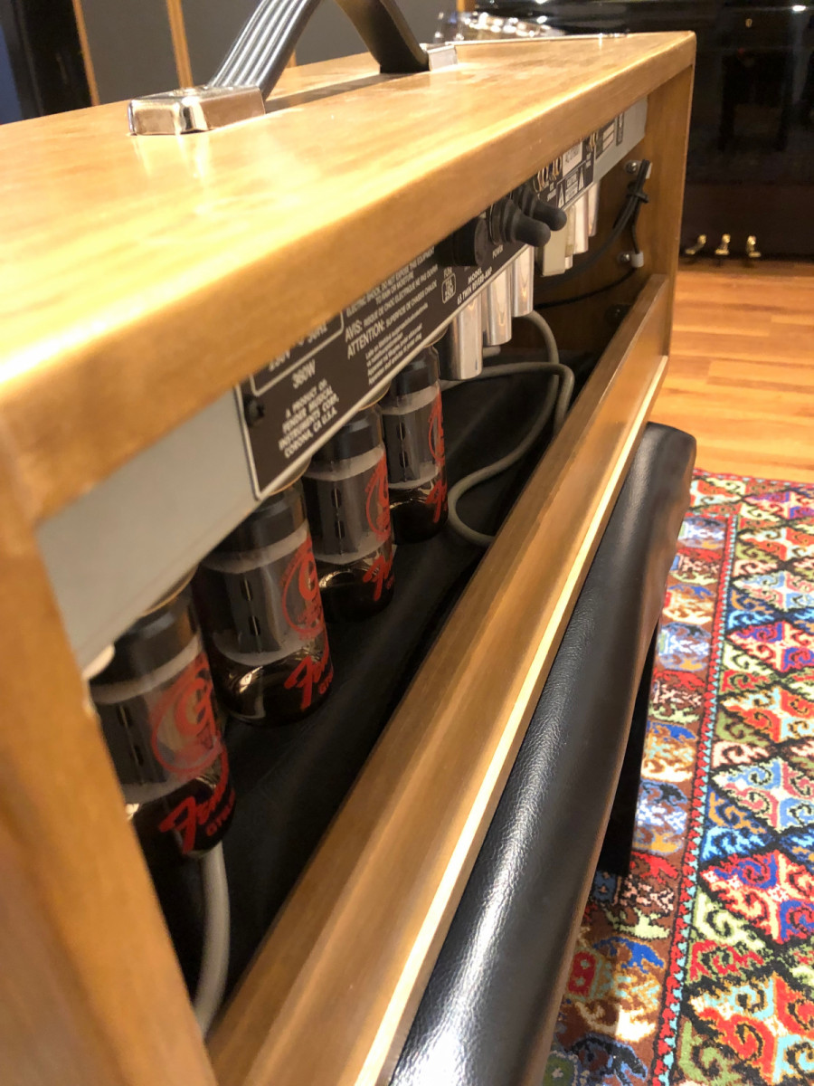 Vendo mueble de pino abeto hecho a mano para alojar a modo de modo cabezal un amplificador Fender Twin Reverb. Tiene todos los agujeros hechos para instalar el ampli, la reverb y sujetar todos los cables.