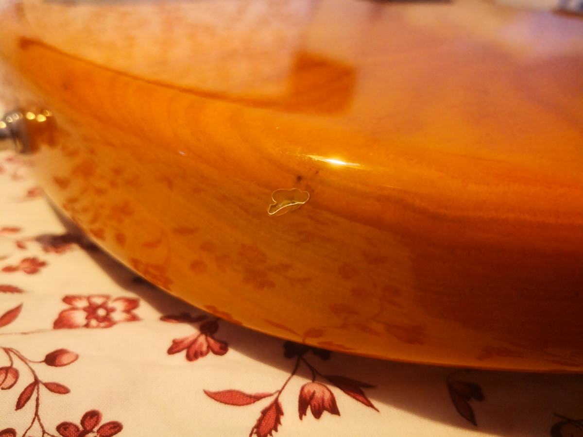 Está en muy buen estado, sólo tiene una chispazo en el cuerpo y la placa metálica trasera tiene una pequeña "rasgadura". Se adjuntan fotos de ambos desperfectos.