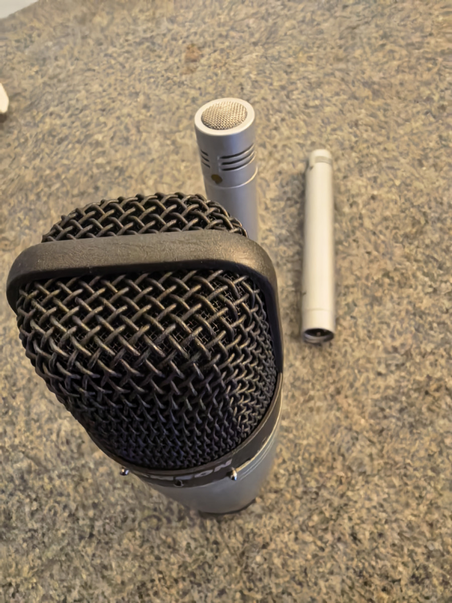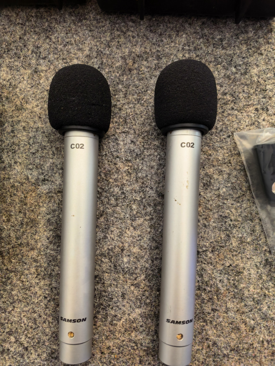 Pareja de Samson C02 (Los finos): Par de micrófonos de condensador tipo "lápiz" (matched pair). Perfectos para grabar en estéreo, platos de batería (overheads), guitarras acústicas o piano.