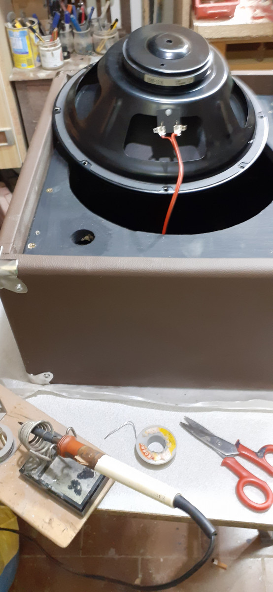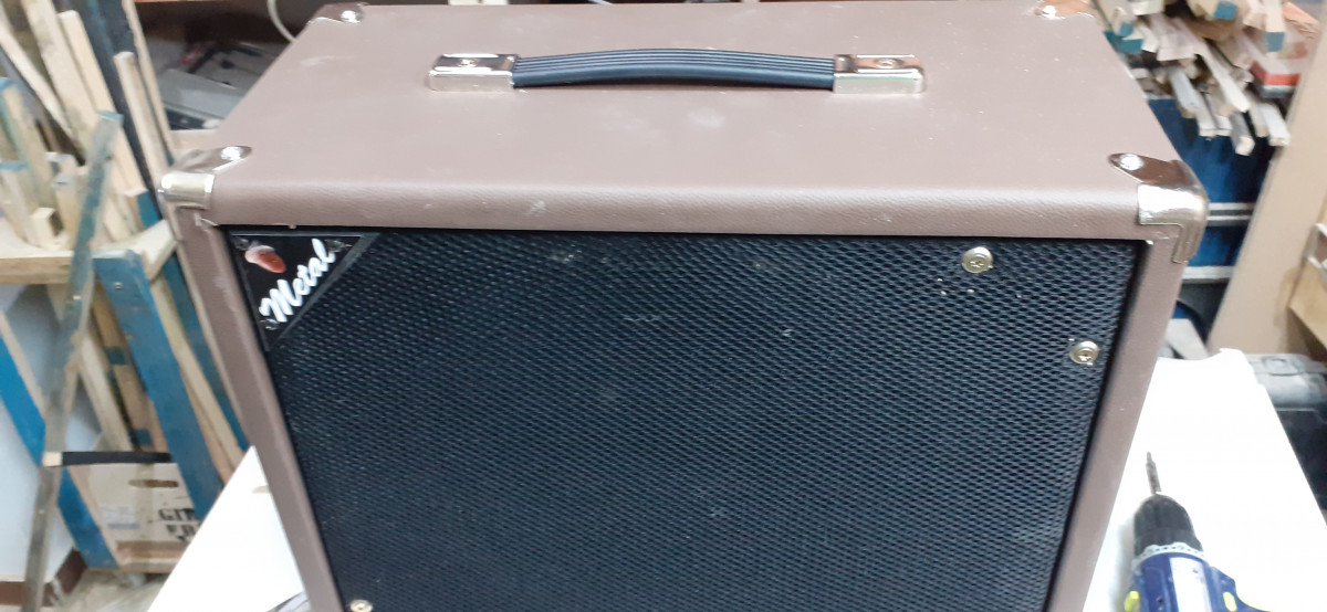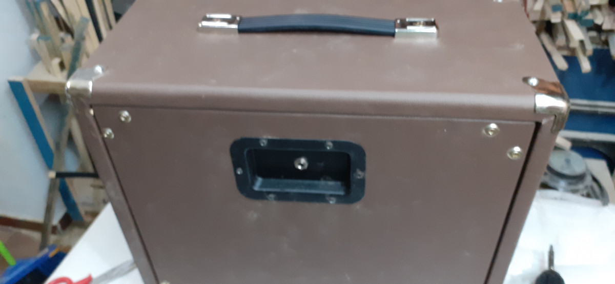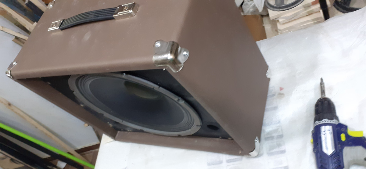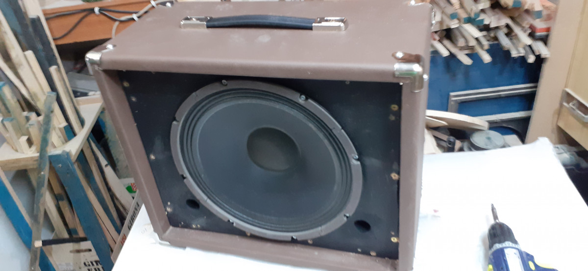 Pantalla artesanal 1x12 con altavoz Kustom 12" 8ohmios 80w. Seminuevo. Pantalla. Muy reducida:46×39×23 ps.11kg. Tolex Marrón y tela negra. También podría interesar algún cambio.
