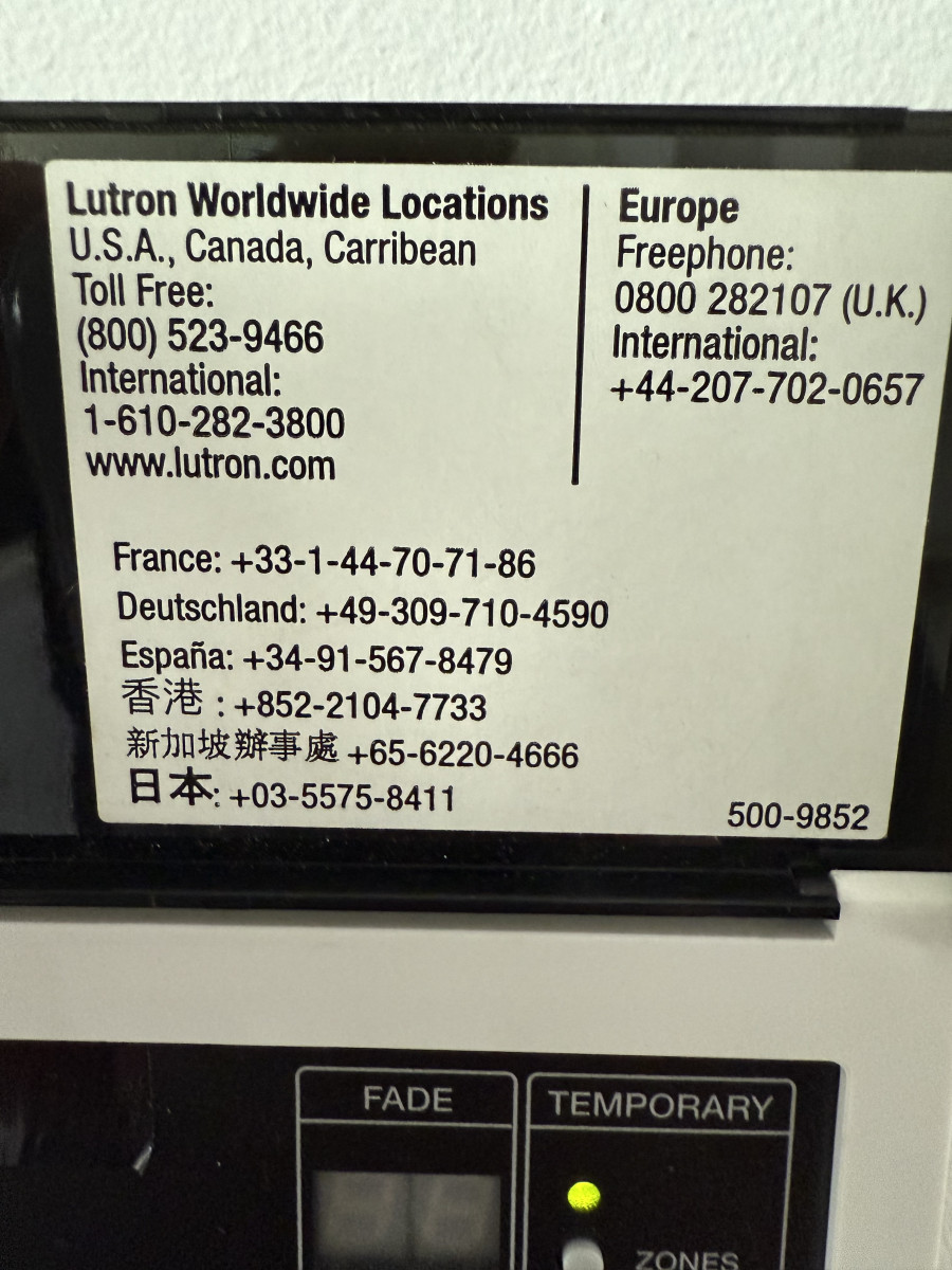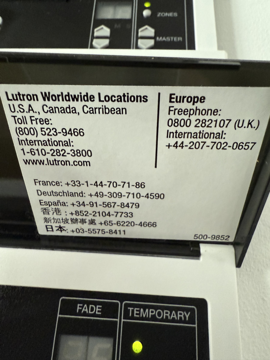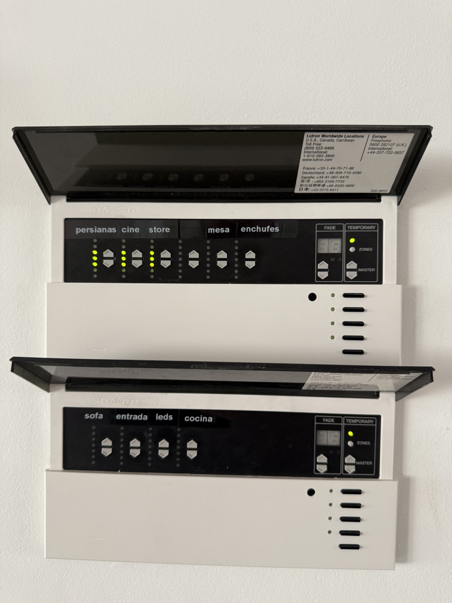 Vendo 2 paneles de control de iluminacion Lutron Grafic Eye de 6 canales,2 botoneras de pared (llevan cable y caja de reles (sin foto )buen estado y funcionando perfecto todos los canales regulando incandescencia (halogenos con transformador) y uno con led , algunos controlan motores, personas /pantalla video, incluye caja de reles (sin foto )desconozco si pueden regular leds todos los canales, sistema de alta gama que en el 2006 costaba 12.000€ pero seguramente sero bsoleto para tecnologia led , por lo que seria valido para alguien que lo tenga ya y se haya estropeado o lrepuesto, onoara alguien manitas que quiera investigar