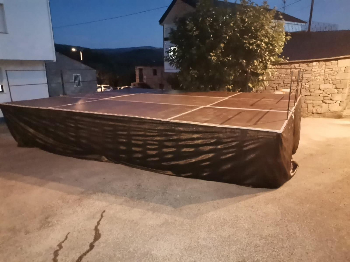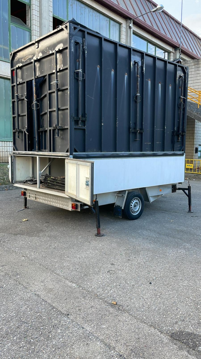 Remolque escenario de 8x6 metros y 1,60 metros de alto. Muy fácil de transportar y de montar (2 personas en 30 min). Incluye escaleras, vallas para el perímetro y puntales. Se puede montar perfectamente sobre superficies irregulares o inclinadas.