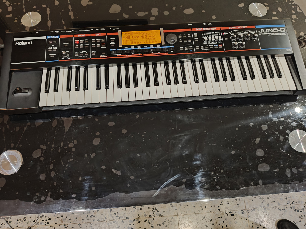 Sintetizador Roland Juno G en excelente estado, con pantalla nueva que entre gastos de envío y aduanas al comprarla en Reino unido me costó casi 300 euros. Incluye manuales y cargador original. Siempre cuidado con mucho mimo y como se puede apreciar en las fotos su estado estético y funcional es excelente.