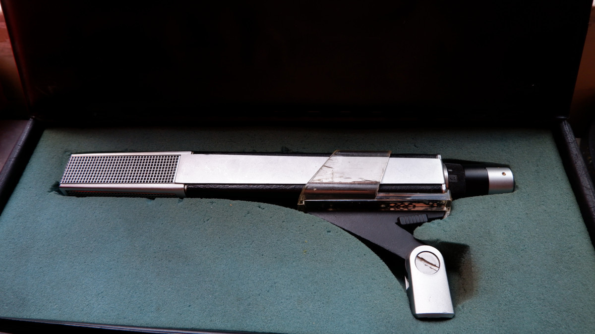 Micrófono Sennheiser MD 441 U vintage con su pinza y estuche. La pinza tiene una pequeña rotura como se muestra en la foto.