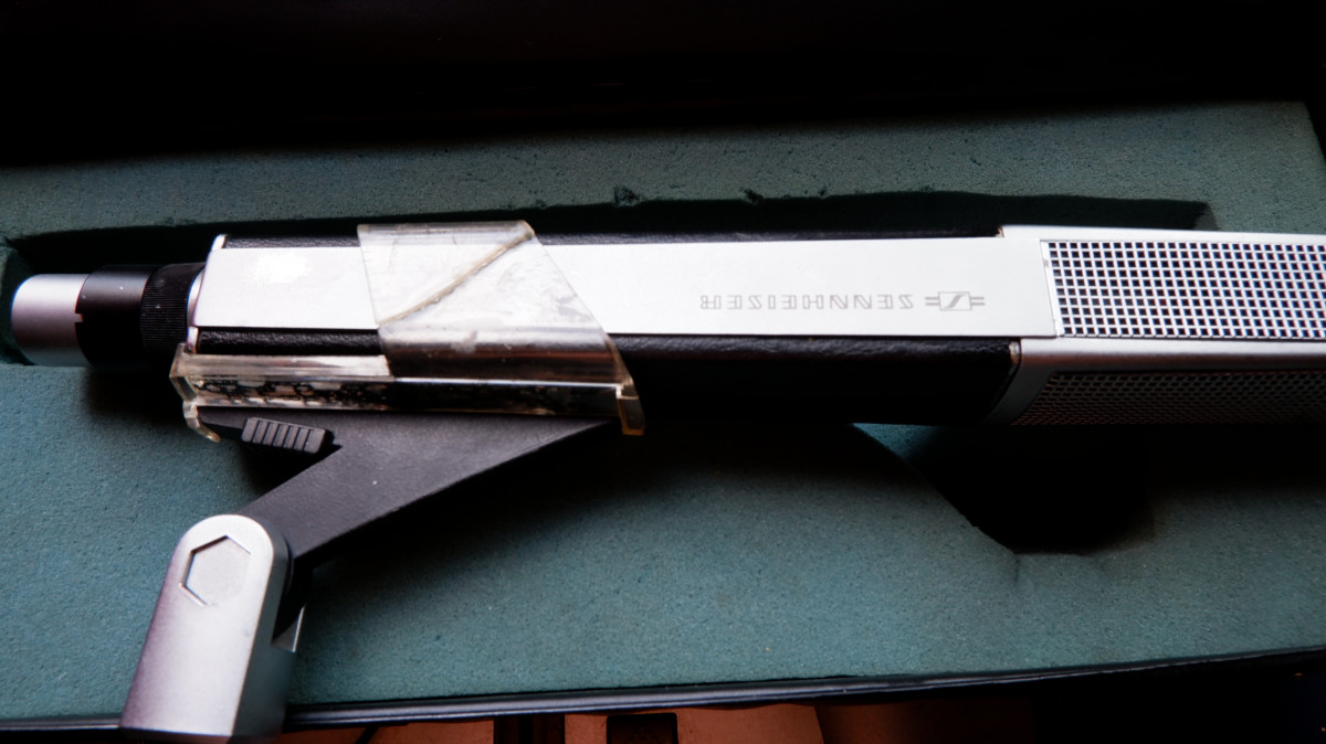 Micrófono Sennheiser MD 441 U vintage con su pinza y estuche. La pinza tiene una pequeña rotura como se muestra en la foto.