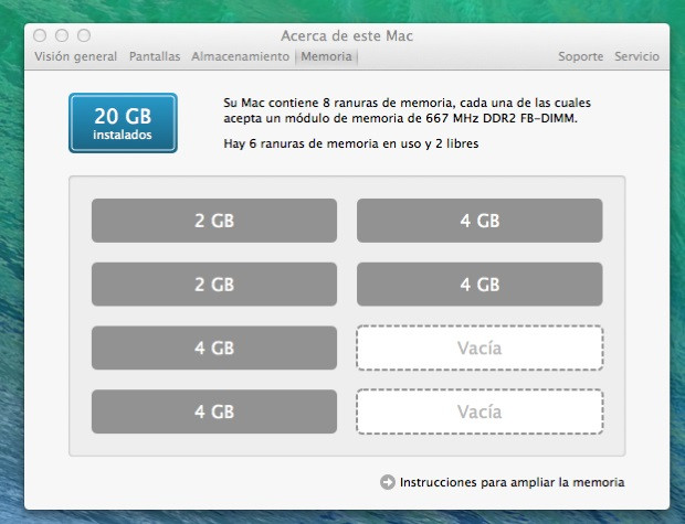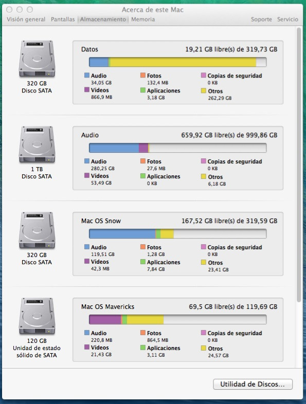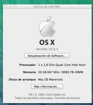 - Mac Pro Early 2008 (3.1, 8 núcleos, 20Gb de RAM, disco SSD de arranque de 120Gb más 3 HDDs adicionales, con MAC OSX 10.9.5)