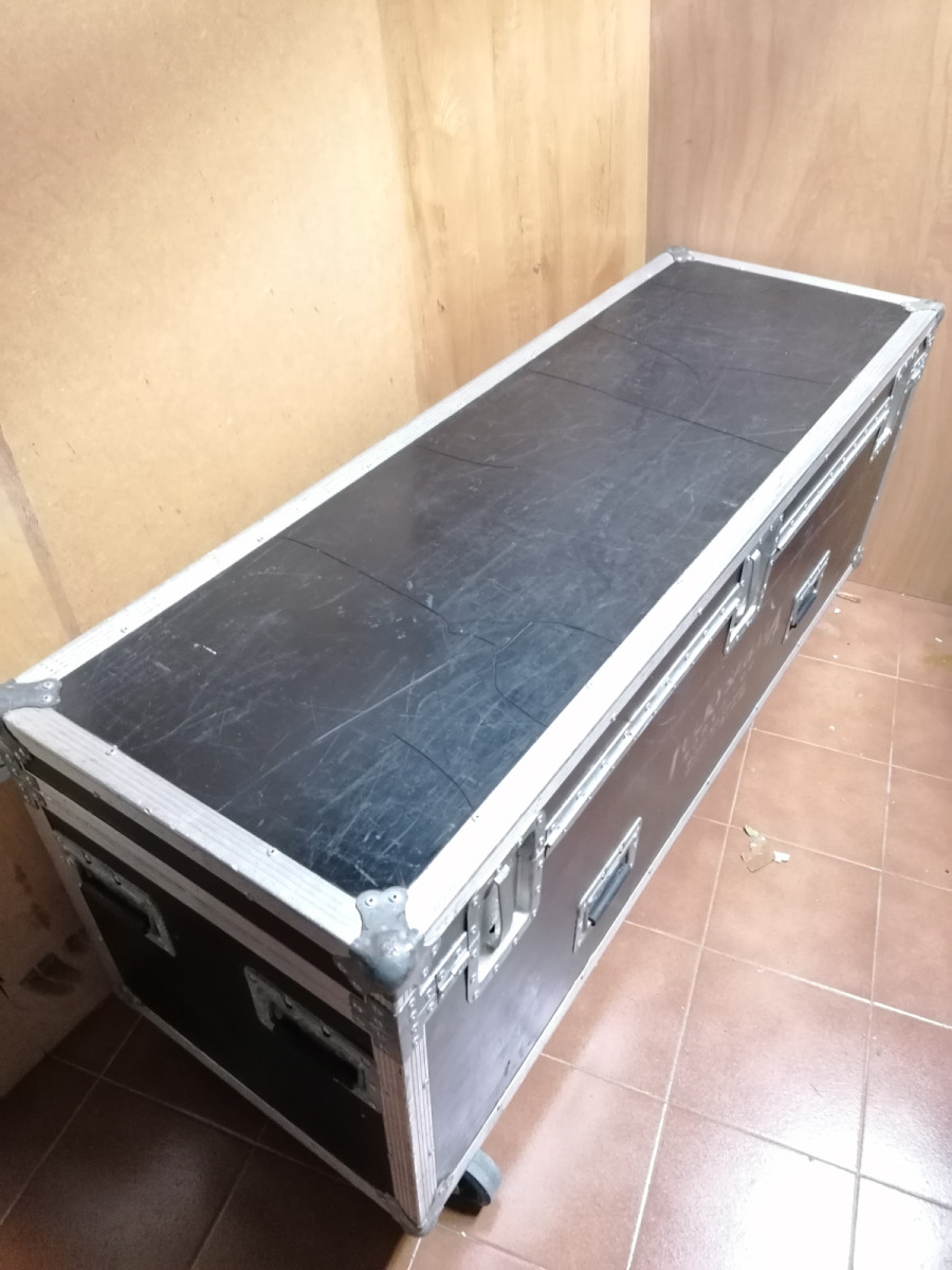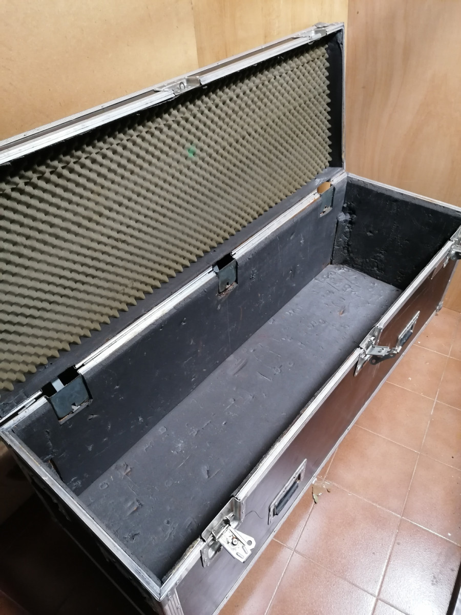 Flight-case con ruedas de grandes dimensiones, forrado con espuma y acolchado también en la tapa. Caja tipo arcón o baúl, para equipos de audio profesional de grandes dimensiones, pies de micro, DJ, herrajes de batería, platos, etc.