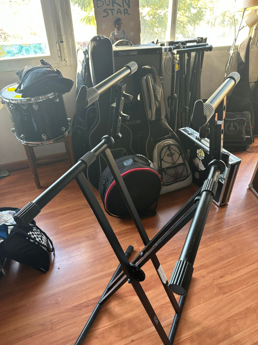 Soporte doble para teclados, modelo EK KS027. Estructura metálica resistente y plegable.