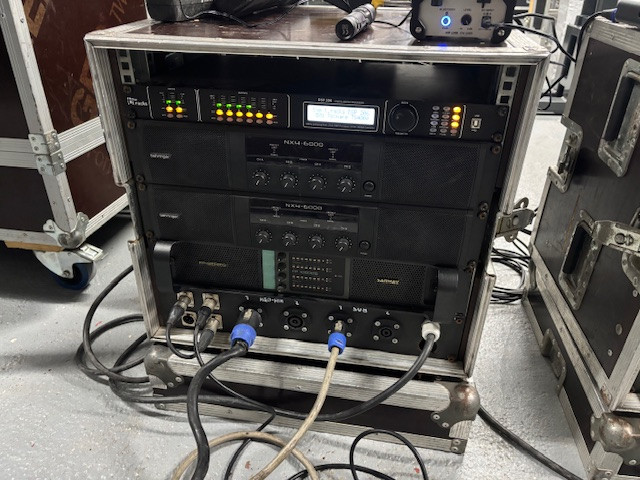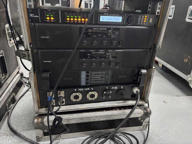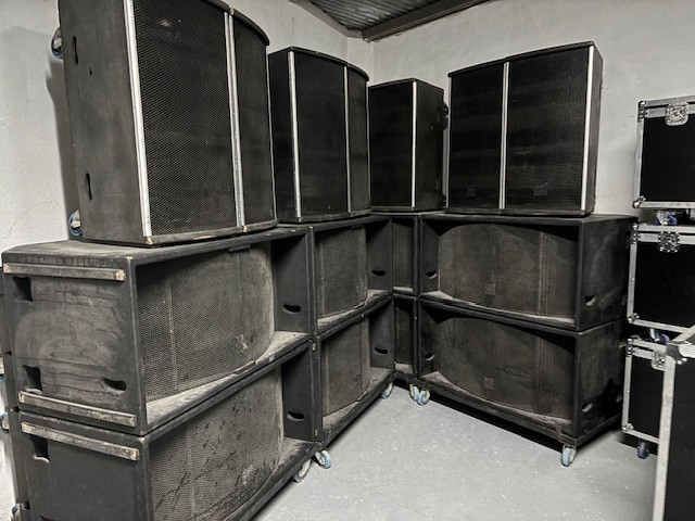 8 Sub L1818 1200W con 4 carros de transporte y sus Rack de Etapas y procesadores T-Racks DSP206 con router para conectar el ordenador por Wifi al procesador.