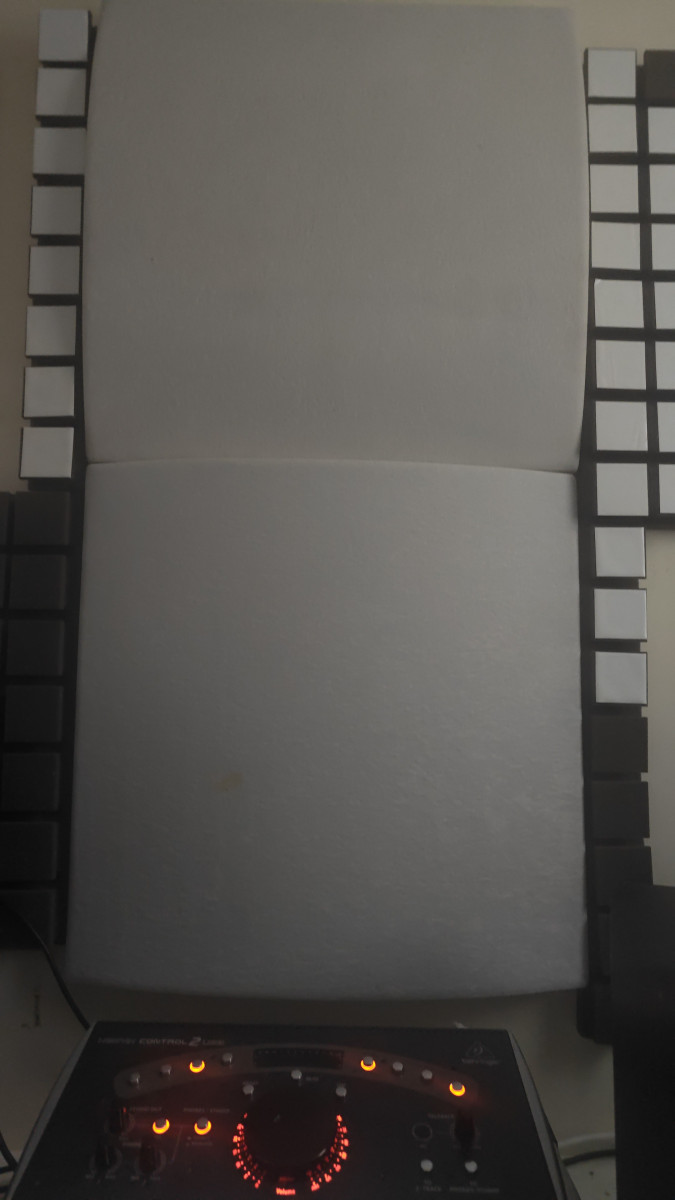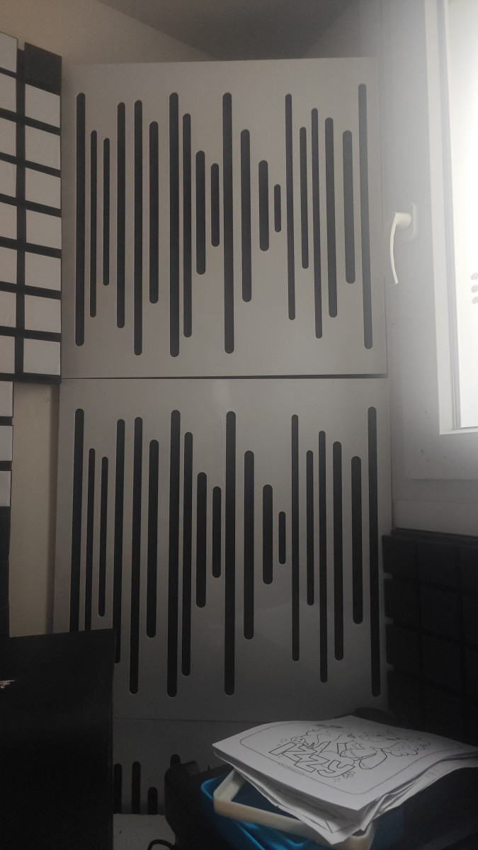 En total unos 12 de vicoustic madera lacada en blanco, 8 de absorvente color antracita suave y regalo absorvente negro