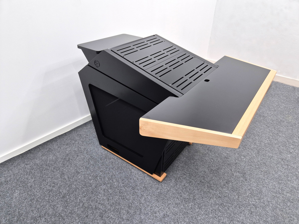 Mesa lacada en negro o Blanco según elección de color y con tela acústica tanto en costados como en la parte delantera inferior y trasera. La mesa es nueva a estrenar.
