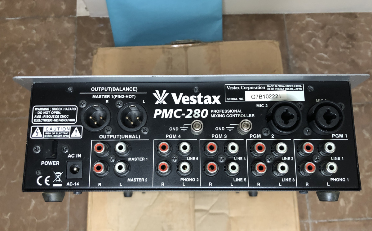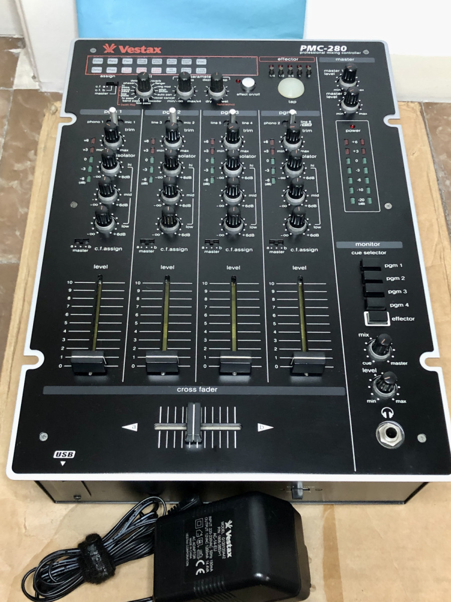 Mesa de mezclas VESTAX PMC-280 en excelentes condiciones. Se incluye el mezclador, su fuente de alimentación, embalaje e instrucciones originales.