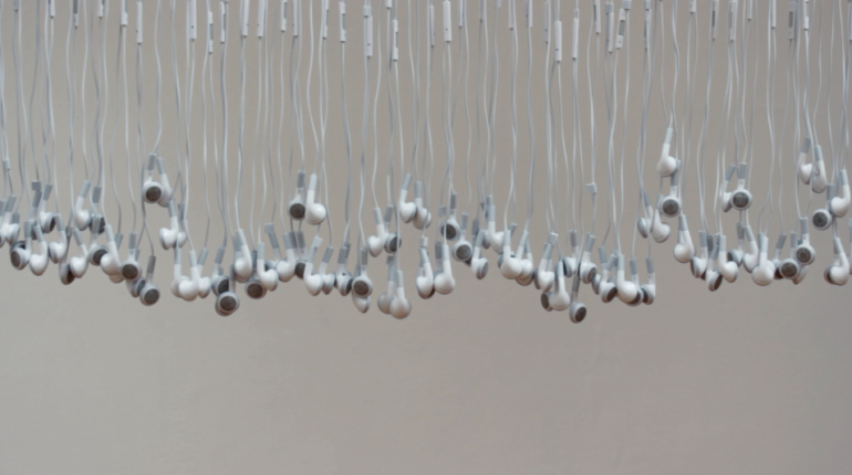 Cabe recordar que aunque visual y materialmente la instalación tiene de entrada una interesante reflexión, –un tanto pop si ahondamos en la elección particular de auriculares blancos de esta marca específica–, es ante todo una obra sonora, donde en cierto punto lo material transmigra y cede ante lo sonoro para permitirle su propio espacio, lo cual se expresa en el contraste entre la linealidad de lo plástico generada por los cables, y lo rizomático del sonido evocado.