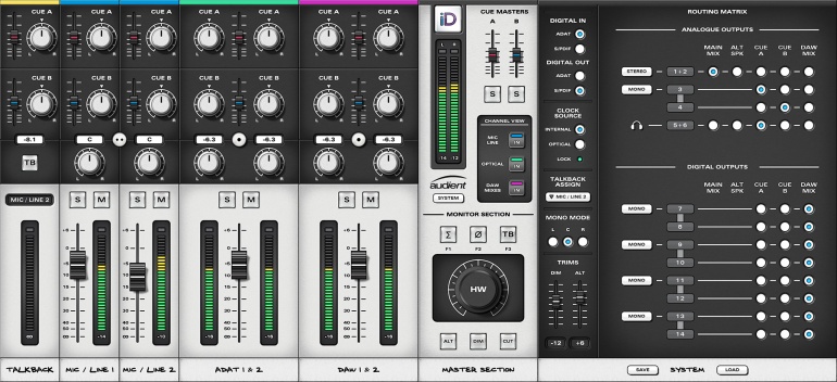 La menor generosidad del iD14 en cuanto a entradas y salidas se ve reflejado en el panel de control del software, que ahora sólo muestra un único bus cue-mezcla. Sin embargo, la gran mayoría de funciones que ofrece la versión para el iD22 permanecen y es posible mostrar y ocultar diferentes secciones del mezclador, de forma que es fácil adaptarse al modo de trabajo de cada usuario.