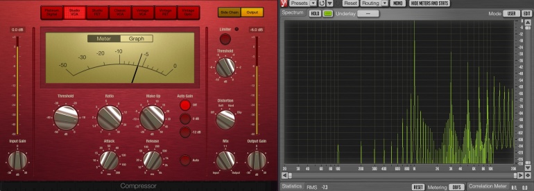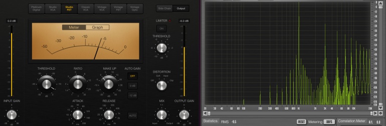 [Índice]Retiramos tanto la distorsión como el limitador y procedemos a analizar la sección del compresor. Ajustamos el compresor durante las siguientes pruebas para que su reducción de ganancia sea de 6dBs según su vúmetro, y vamos variando los tiempos de ataque y relajación para ver como reacciona.