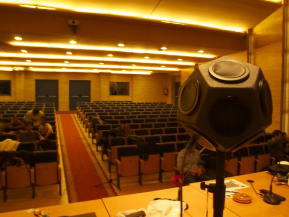 Cuando vamos a medir el aislamiento entre dos salas, una de ellas será la emisora (la más grande) y para emitir ruido se pondrá un altavoz. Recomiendo usar ruido rosa. El altavoz que debe usarse es omnidireccional y por tanto hacia dónde apunte en el momento del ensayo no es importante. Vamos a salirnos de norma y vamos a usar un monitor, preferentemente uno de directo, que puede darnos más nivel que uno de estudio. Intentaremos pues no apuntar directamente al micrófono ni perpendicularmente a la pared separadora.
