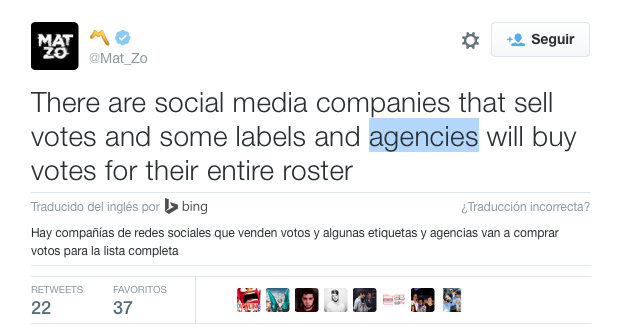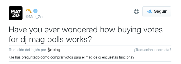 A pesar de todo, artistas de primera línea como Mat Zo afirman que es posible realizar la compra de votos, y que incluso un amigo suyo creó una empresa para tal fin a la que recurren grandes nombres de la escena DJ. Lo afirmó en Twitter el año pasado, aquí podéis ver las capturas de su cuenta. Los mensajes no los ha retirado y pueden verse en su cuenta:
