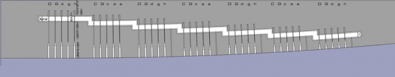 Dicha estructura divide los 35 tubos en grupos de 7, organizados de forma alternada en dos variaciones armónicas de la escala diatónica mayor, la cual es tradicional en esta región del país. De esta forma, con tan solo ubicarse en una de las zonas centrales, es posible escuchar entre 5 y 7 sonidos simultáneamente, cosa que se entiende más fácilmente en el siguiente gráfico: