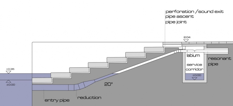 En cuanto al diseño del instrumento en cuanto tal, encontramos datos no menos interesantes: fue logrado con una precisión asombrosa, puesto que no solo los tubos se activan mediante la presión del viento y el mar, sino que están afinados y ubicados estratégicamente para generar determinados patrones musicales. Cada tubo es activado por una columna que relaciona la presión del agua con el aire, resultando en un sonido que es emitido al exterior por medio de unas aperturas ubicadas en la superficie de la construcción, como se ejemplifica en el siguiente gráfico:
