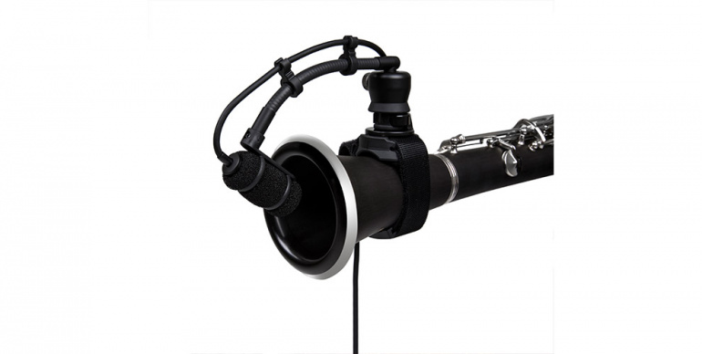 Los instrumentos de viento de madera presentan un reto importante, en cuanto a su montaje, principalmente porque la fijación de tipo pinza de cocodrilo que funciona perfectamente para los instrumentos de metal, tiende a ser ineficaz en la campana de los instrumentos de viento de madera, que suele ser mucho más gruesa. La solución propuesta por Audio-Technica se materializa en el modelo AT8491W, que incorpora una base de goma redondeada que se asienta en prácticamente cualquier parte tubular de un clarinete, oboe o flauta, por ejemplo, y que se asegura con la ayuda de una tira de Velcro que incorpora una segunda sección de goma curvada que asegura una fijación estable por el lado opuesto del tubo del instrumento. En la parte superior de esta base se fija un flexo, asegurado por medio de una clavija; esta sección superior puede rotar en incrementos de 45º para ser posicionado de forma que el micro apunte convenientemente hacia la campana del instrumento.