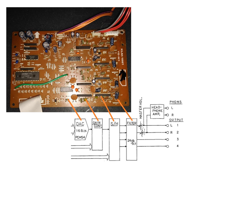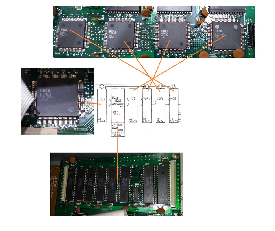 - Por otro lado, en la parte inferior del diagrama vemos la "chicha", el motor de síntesis, PCM ROM y la parte de conversión. En el diagrama la señal fluye de izquierda a derecha, en la placa es alrevés, tenemos el generador en el lado derecho y de ahí hasta la unidad de efectos, en el lado izquierdo: