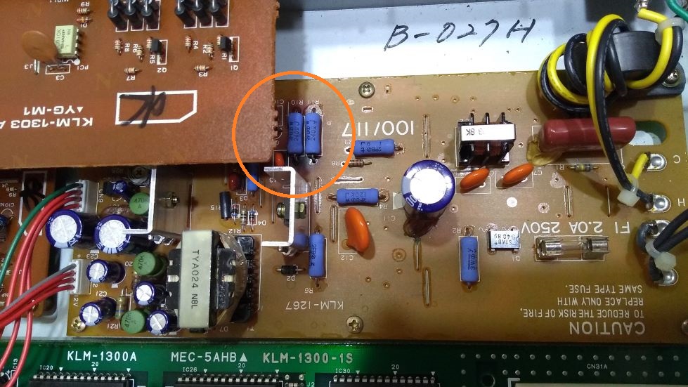 - La fuente de alimentación de 100/117 voltios en muy buen estado exceptuando lo señalado en el circulo naranja, la placa está un poco chamuscada porque la temperatura que deben pillar esas 2 resistencias debe ser alta... es poca cosa y se podria arreglar facilmente soldando esas resistencias alejándolas de la placa:
