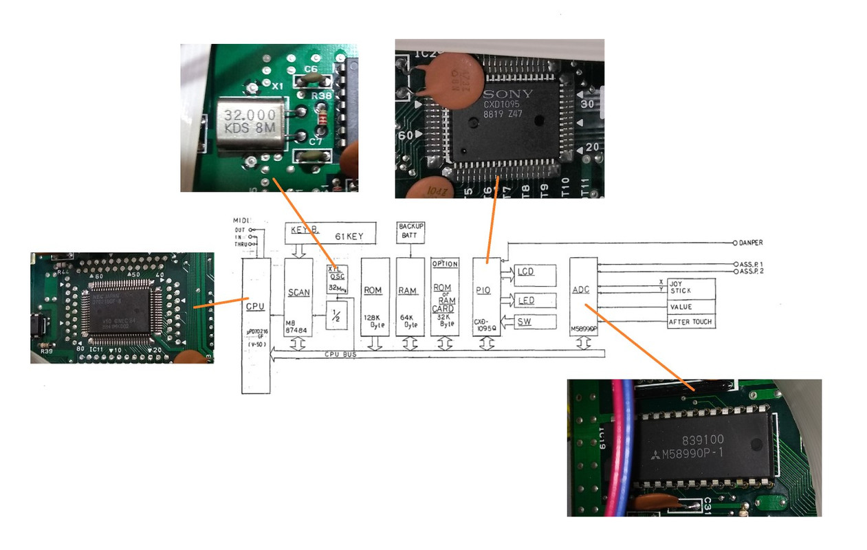 - Esta es una imagen de la parte superior del diagrama acompañada de algunos componentes que he ido localizando en mi unidad. La V50 (por abreviar) de Nec que es una CPU de 16 bits bastante usada en aquella época en estos trastos, el reloj a 32Mhz, control de LCD y Switches (PIO, Programmable Input/Output) o el conversor AD para señales continuas tipo Aftertouch o pedales asignables...:
