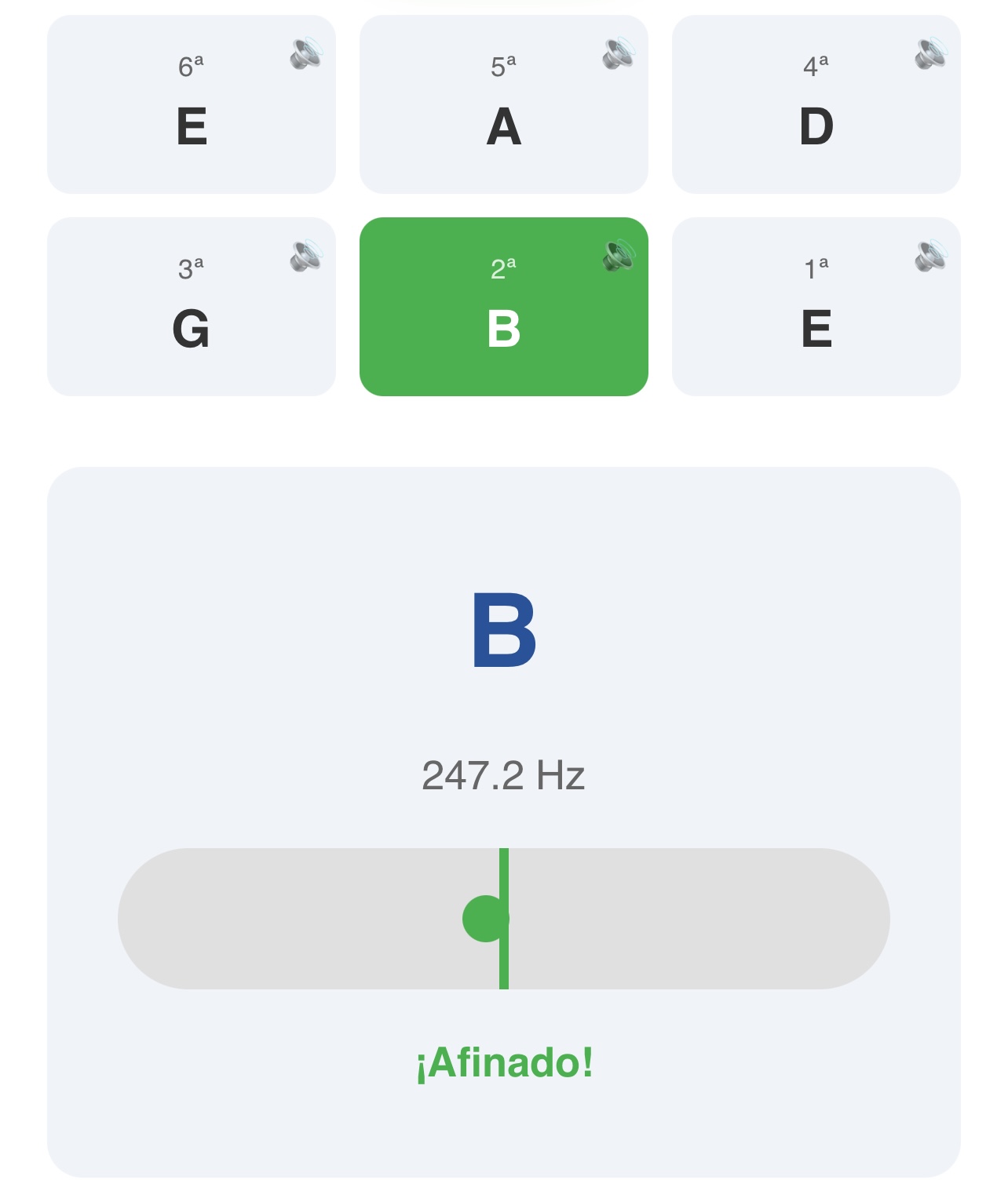El afinador de guitarra online que presenta Guitarristas hoy se basa en un algoritmo de detección de frecuencia muy preciso, y ofrece 8 afinaciones distintas, incluyendo Standard, Drop D, Drop C y Open G. Además, si quieres afinar de oído, puedes escuchar tonos de referencia pulsando el botón correspondiente a cada cuerda.