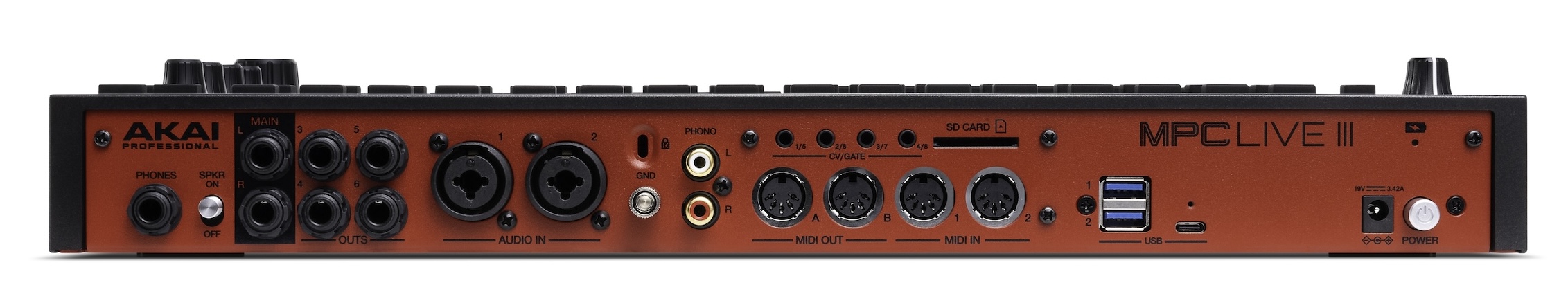 [Índice]El MPC Live III incluye ahora dos previos con conexiones combo XLR /TRS, entrada phono estéreo, seis salidas de audio independientes, salida para auriculares, dos puertos MIDI de entrada y dos de salida, ocho conexiones CV, USB-C para comunicación con el ordenador, dos puertos USB de entrada para conectar teclados MIDI y otros periféricos y un lector de tarjetas SD.