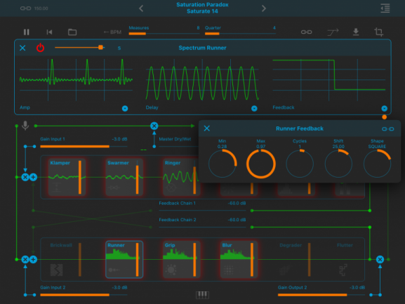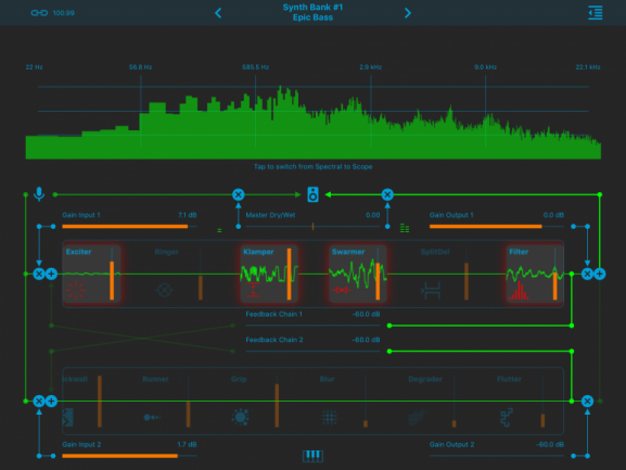 Al parecer se trata de una app que no se puede encasillar meramente en determinada categoría, en tanto, según dejan ver las capturas de pantalla, está enfocada en ofrecer una multiplicidad de procesos de control, generación, efectos y modulación, incluyendo desde complejas rutas de filtros y efectos, hasta controles de dedicados de procesos espectrales, granulares, de modulación en anillo. Según se aprecia, incluye varias opciones de conexión y cuenta con varios modos de operación y asignación de entrada, incluyendo entrada de audio, sampler y sinte.