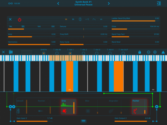 El sistema de medidores y rutas está creado bajo la misma identidad gráfica de otras de sus apps, aunque agregando un nivel de complejidad mayor e integrando varias opciones en una, dado que si bien se da gran importancia a la ruta de efectos y procesos en varios niveles, se presentan también secciones dedicadas de control desde teclado y funciones de síntesis y sampling, con sus controles respectivos.