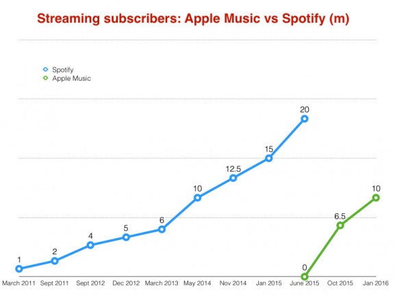 En la web especializada en asuntos del negocio musical Music Business Worldwide han realizado una tabla comparativa sobre la evolución de usuarios de Apple Music frente a los datos de Spotify. El contraste es muy notable.