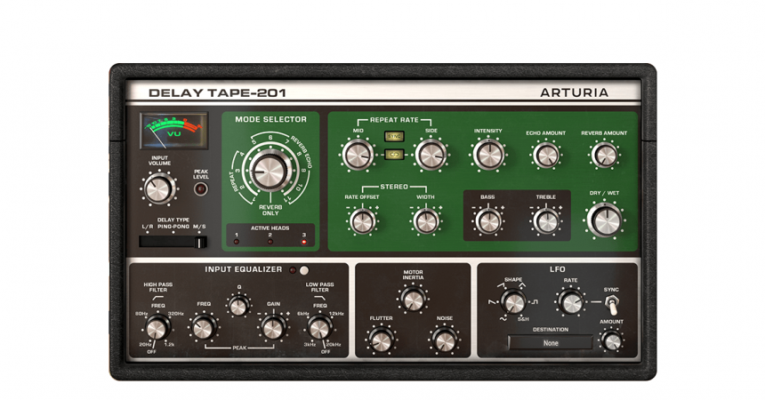 Delay Tape-201 es una emulación del famosos Roland Space Echo, que emergió en los 70s y desde entonces se ha ido consolidando como todo un estilo particular de delay, basado en eco de cinta, con sonido saturado, reverb spring integrada y algunas funciones agregadas de la emulación.