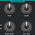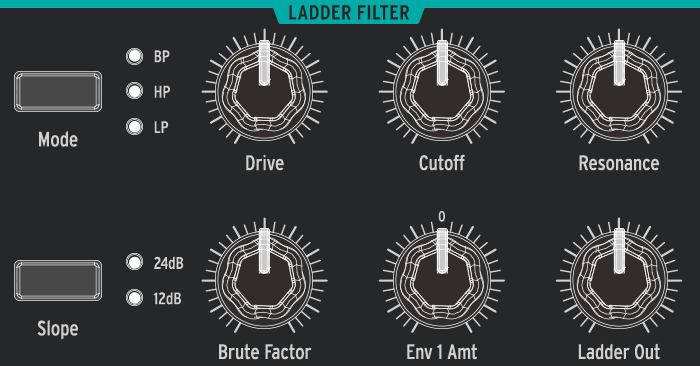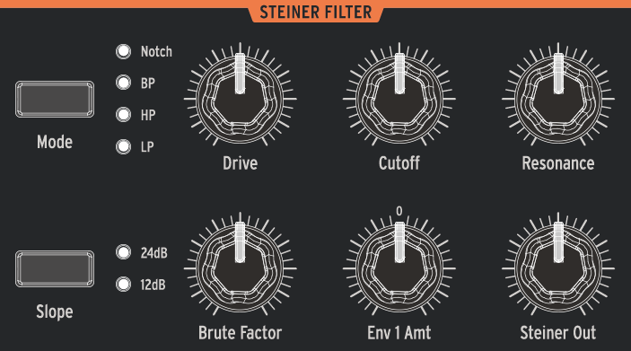 El Steiner-Parker convertido en sello común de todos los modelos 'Brute', y que en el Matrix permite selección entre respuesta 12 o 24 dB/oct, además de seguir contando con sus 4 modos (LPF, HPF, BPF y Notch) y el control de saturación 'drive' más el 'brute' para forzar un lazo de realimentación que devuelve la salida como una entrada más hacia el filtro generando unas dosis extremas de distorsión. Y junto a él un clásico 'ladder' de inspiración Moog también seleccionable 12/24, y con sus propios controles 'drive' y 'brute'.