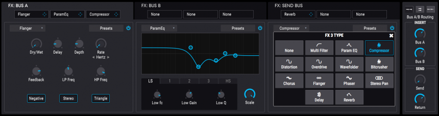 En varios apartados compendia objetos ya vistos en anteriores productos Arturia. Así, los dos filtros admiten 8 tipos que reviven filtros clásicos multimodo, SEM, Matrix 12, Mini e incluyen otras respuestas más atípicas como comb, phaser, formantes o un filtro ultra selectivo (surgeon). Los parámetros en cada uno de ellos varían en función del tipo e incluyen en algunos la selección del modo del filtro (incluso la variación continua desde paso bajo a paso alto pasando por paso banda, u otros), la modulación de la frecuencia de corte, el número de etapas del phaser, o el grado de realimentación del comb y si debe o no seguir las evoluciones con distintas notas desde el teclado. Demasiados detalles para parar aquí de uno en uno en detalle.