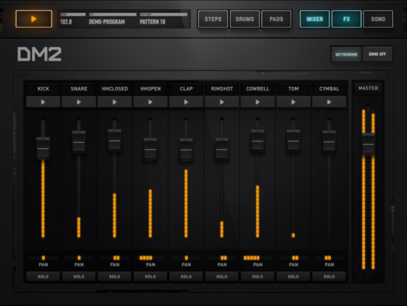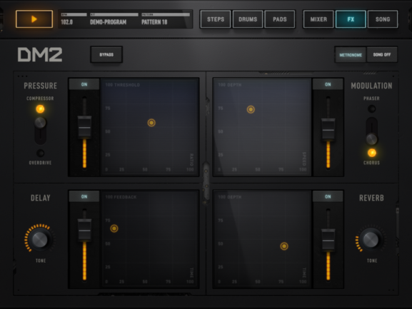 El nuevo motor de audio está basado en Pure Data, permite copiar y pegar sonidos, cambiar sonidos entre pistas, grabar patrones, controlar cada sonido individualmente desde el mixer, entre otras opciones. El sistema de efectos global se conserva muy similar a DM1, en una estructura basada en cuatro pads XY con diversas opciones de efectos (chorus, reverb, delay, compresor).