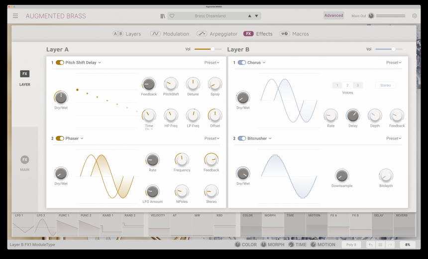 Para los que lo deseen, la intervención fina, extremadamente detallada, es totalmente posible. A ese respecto si queréis recordar lo que tienen en común los 'Augmented' podés revisar nuestras reviews de Aug. Strings y Aug. Voices, puesto que aunque las muestras y los presets son específicos y orientados a metales, la arquitectura que subyace a todos ellos la misma, y en el fondo no muy distante de la completísima con la que Arturia dotó a su sintetizador Pigments. De hecho varias de las mejoras que ha recibido mediante actualizaciones Pigments se están trasladando también a todos los Augmented, entre los que, además de los ya citados, se encuentra Augmented Grand Piano... Sí, ya van cuatro. Y sí, no dudamos que llegarán más.