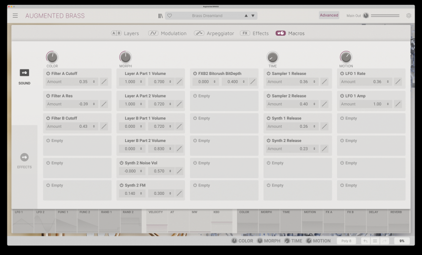 Quienes buscan sonidos listos para usar, pero con amplia variación tímbrica fácil de controlar, agradecerán la vista centrada en 8 controles sencillos. El de 'Morph' casi siempre realiza una transición gradual partiendo de un sonido más bien natural/acústico y transformándolo hacia otro claramente intervenido por lo electrónico. La constelación de otros 7 controles alrededor del de 'Morph' regula diferentes aspectos del sonido. Y jugando sencillamente con esos 8, ya sea en pantalla, ya sea con controladores físicos, o bien mediante automatización en DAW, realmente se consiguen unos cambios enormes en la expresión y carácter.