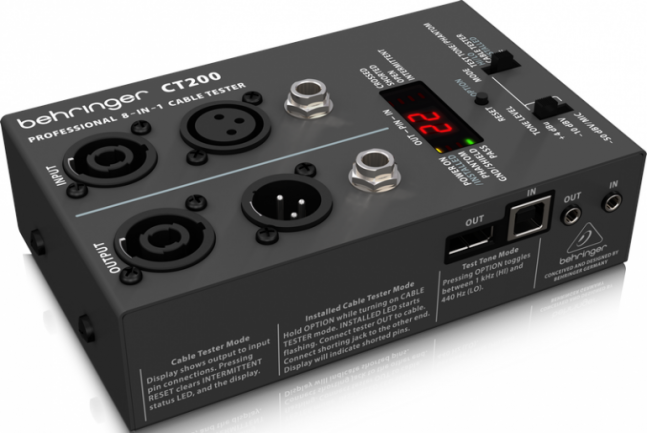 Un verificador del estado de los cables acaba por ser en esos ámbitos un valioso aliado. Behringer CT200, al precio de aprox. 40€ es una nueva versión sustituta del anterior CT100, y que cuenta ahora con opciones para comprobar tanto cables audio como datos. Varias de las pruebas podrían relizarse también mediante un vulgar polímetro, pero no con la facilidad e inmediatez de un equipo dedicado como este.