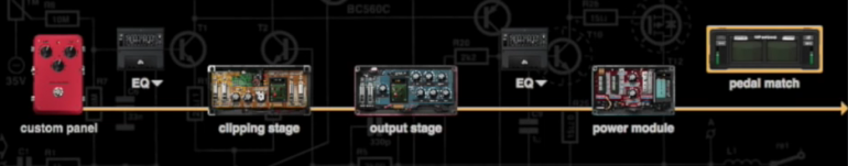 Ofrece varias secciones consecutivas que incluyen una etapa de entrada/clipping, una etapa de salida y un módulo de potencia, con varios controles editables en cada uno de ellos, y la posibilidad de incorporar EQs tanto pre como post, una técnica que siempre recomiendo con las distorsiones para poder elegir con el pre qué es lo que vamos a usar como material fuente principal cara a la distorsión evitando el exceso de componentes que rápidamente degradan los resultados con las distorsiones más feroces, y pudiendo con el post acondicionar el sonido resultante. También opcional el uso de un módulo ‘pedal match’ que puede escuchar y aprender del sonido de una distorsión externa para intentar recrearla.