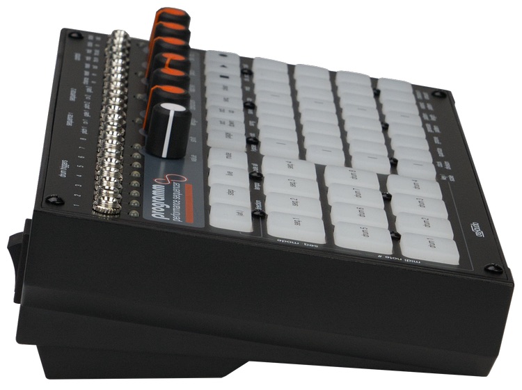 La interfaz de Programm es un elemento muy importante. Su matriz de 32 pads funciona como programador por pasos, teclado y pantalla dinámica que muestra información clave como valores de nota, escalas, modos de alatorización, offsets y más. Todo ello acompañado de un vistoso despliegue luminoso. A esto se suman varios potenciómetros que permiten editar pasos de forma inmediata, sin menús ni navegación profunda.