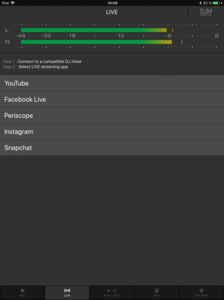 La aplicación detecta automáticamente cuando el iPhone o el iPad es conectado a la mesa por el puerto USB tipo A del panel superior –por cierto la mesa tiene que tener el último firmware u os garantizo que la aplicación no funciona– y a partir de ese momento grabar es tan simple como pulsar un enorme botón rojo en la interfaz principal. La grabación es sencillamente idéntica a lo que saque la mesa por el master, ya que toma el audio digitalmente del propio procesado interno de la mesa. La aplicación además te ayuda a hacer streamings en plataformas como Facebook, Youtube, Snapchat o Periscope, enrutando el audio que toma de la mesa a esas aplicaciones. DJM-REC también permite hacer grabaciones tomando como fuente el micro del dispositivo iOS o algún interfaz USB conectado, pero obviamente pierde su gracia, que es conectarlo directamente a la mesa.